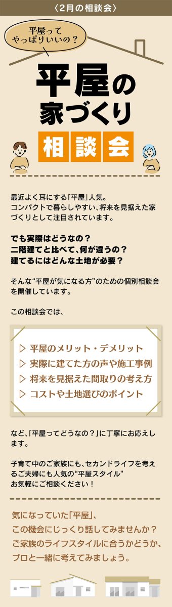 平屋の暮らしやすさや将来性を分かりやすく解説する個別相談会。二階建てとの違いや土地選び、コスト、間取りの考え方まで丁寧にご案内。家族構成に合う住まいを一緒に考えます。